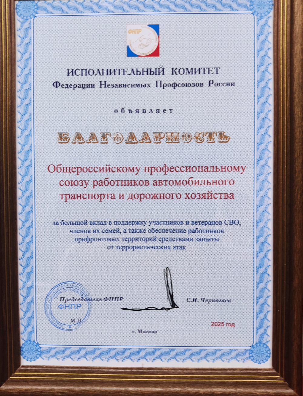 Профсоюзу автомобильного транспорта и дорожного хозяйства вручена Благодарность ФНПР за большой вклад в поддержку участников и ветеранов СВО, членов их семей, а также обеспечение работников прифронтовых территорий средствами защиты от террористических атак.