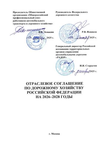 Отраслевое соглашение по дорожному хозяйству на 2026-2028 годы зарегистрировано в Роструде и вступит в действие с 1 января 2026 года 9 декабря 2025 года было подписано Отраслевое соглашение по дорожному хозяйству на 2026-2028 годы. 24 декабря 2025 года Соглашение зарегистрировано в Федеральной службе по труду и занятости (Регистрационный номер 33/26-28). Публикуем текст Отраслевого соглашения и Уведомление о регистрации Соглашения Роструда. НАПРАВЛЕНИЯ ДЕЯТЕЛЬНОСТИ