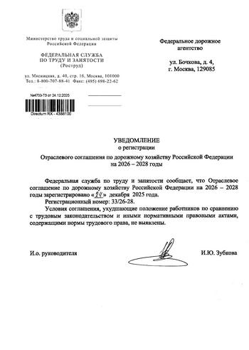 Отраслевое соглашение по дорожному хозяйству на 2026-2028 годы зарегистрировано в Роструде и вступит в действие с 1 января 2026 года