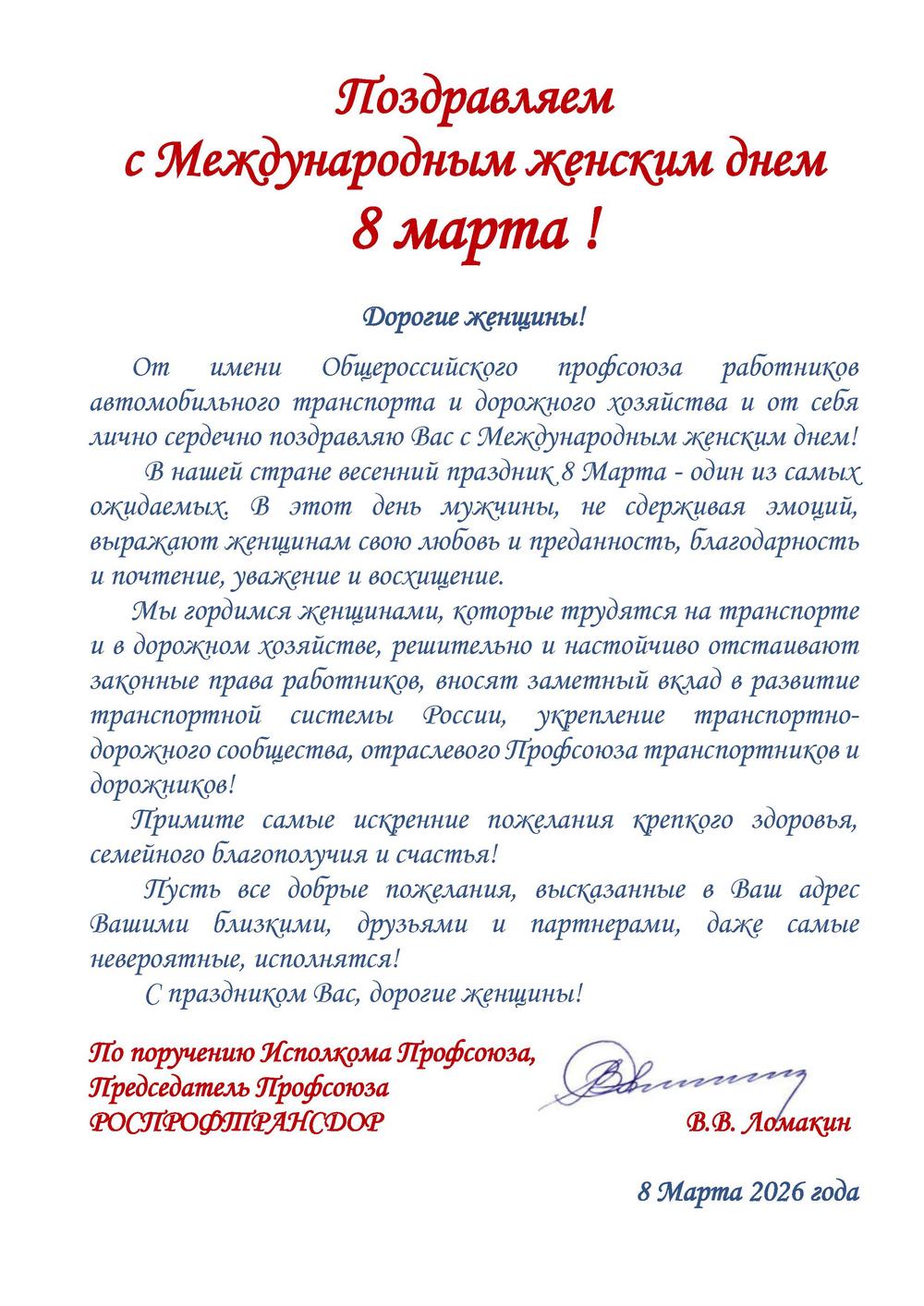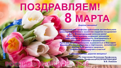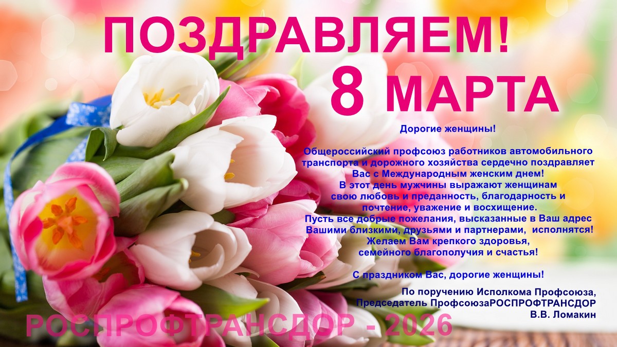 Поздравляем с Международным женским днем 8 марта ! Дорогие женщины! От имени Общероссийского профсоюза работников автомобильного транспорта и дорожного хозяйства и от себя лично сердечно поздравляю Вас с Международным женским днем! В нашей стране весенний праздник 8 Марта - один из самых ожидаемых. В этот день мужчины, не сдерживая эмоций, выражают женщинам свою любовь и преданность, благодарность и почтение, уважение и восхищение. Мы гордимся женщинами, которые трудятся на транспорте и в дорожном хозяйстве, решительно и настойчиво отстаивают законные права работников, вносят заметный вклад в развитие транспортной системы России, укрепление транспортно-дорожного сообщества, отраслевого Профсоюза транспортников и дорожников! Примите самые искренние пожелания крепкого здоровья, семейного благополучия и счастья! Пусть все добрые пожелания, высказанные в Ваш адрес Вашими близкими, друзьями и партнерами, исполнятся! С праздником Вас, дорогие женщины! По поручению Исполкома Профсоюза, Председатель Профсоюза РОСПРОФТРАНСДОР В.В. Ломакин 8 Марта 2026 года Смотреть поздравление Профсоюза с 8 Марта НАПРАВЛЕНИЯ ДЕЯТЕЛЬНОСТИ