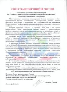 2014-й - ГОД 95 - ЛЕТИЯ ПРОФСОЮЗА Обращение ЦК профсоюза к членам профсоюза, работникам автомобильного транспорта и дорожного хозяйства в связи с 95-летием со дня образования профсоюза. Постановление Исполкома ЦК профсоюза от 11.12.2013 г. № 13/4 "О праздновании в сентябре 2014 года 95-летия профсоюза", которым утверждены: План мероприятий по подготовке и проведению празднования 95-летия со дня образования профсоюза (приложение №1). Состав Организационного комитета по подготовке и проведению празднования 95-летия со дня образования профсоюза (приложение №2). Очерки об истории Общероссийского профсоюза работников автомобильного транспорта и дорожного хозяйства. Профсоюзу автотранспортников и дорожников - 95 лет. 18 СЕНТЯБРЯ 2014 года СОСТОЯЛИСЬ ТОРЖЕСТВЕННЫЕ МЕРОПРИЯТИЯ, ПОСВЯЩЕННЫЕ ЮБИЛЕЮ ПРОФСОЮЗА